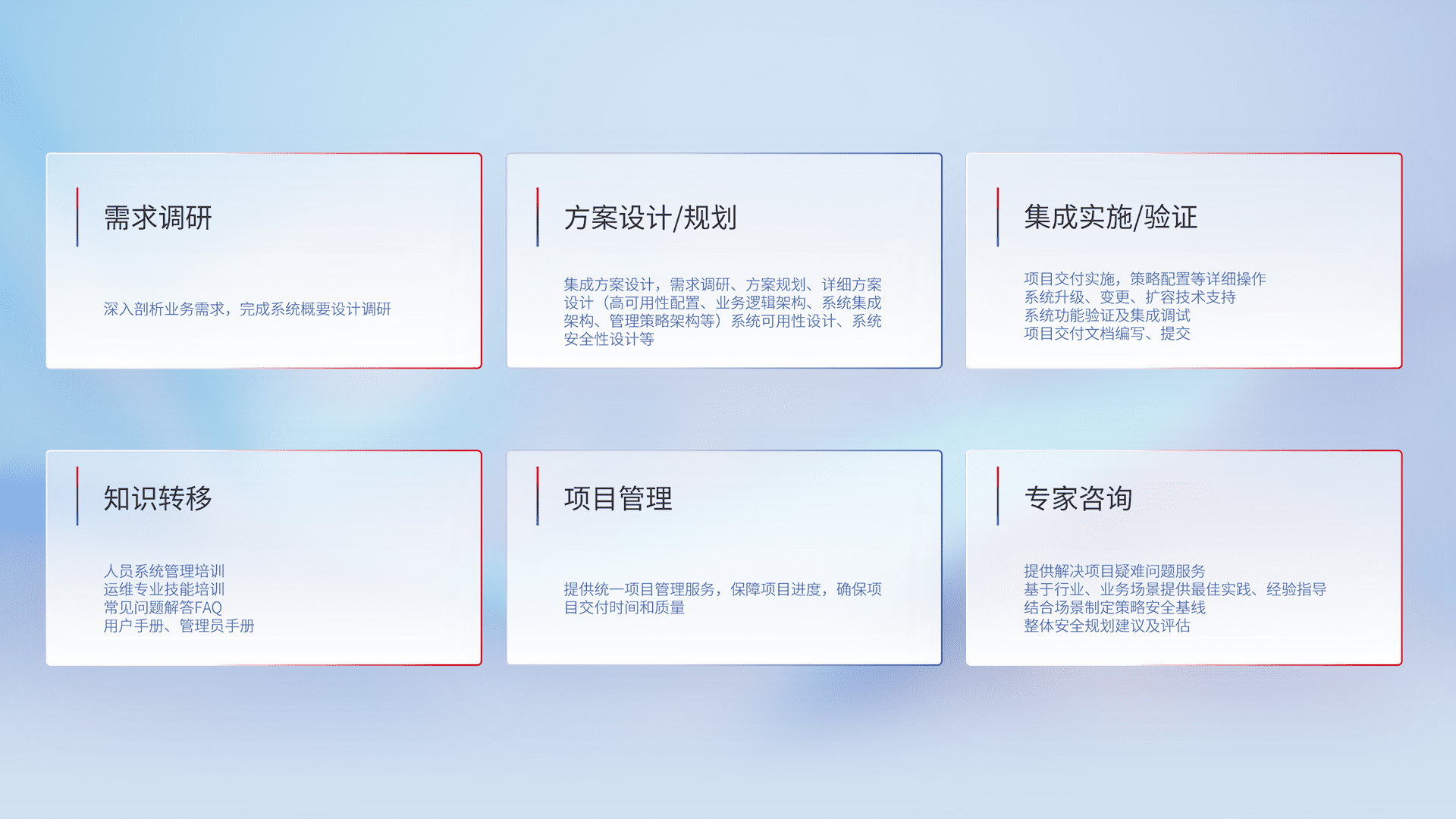 针对客户行业特性,,将宏观的安全战略和需求,,通过专业的交付服务,,实现项目落地,,为客户提供标准规范的集成交付服务。。